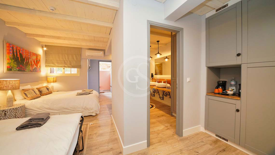 Untere Ebene: 4 Doppelzimmer, alle mit eigenem Bad und separatem Zugang zu einer großen Terrasse.